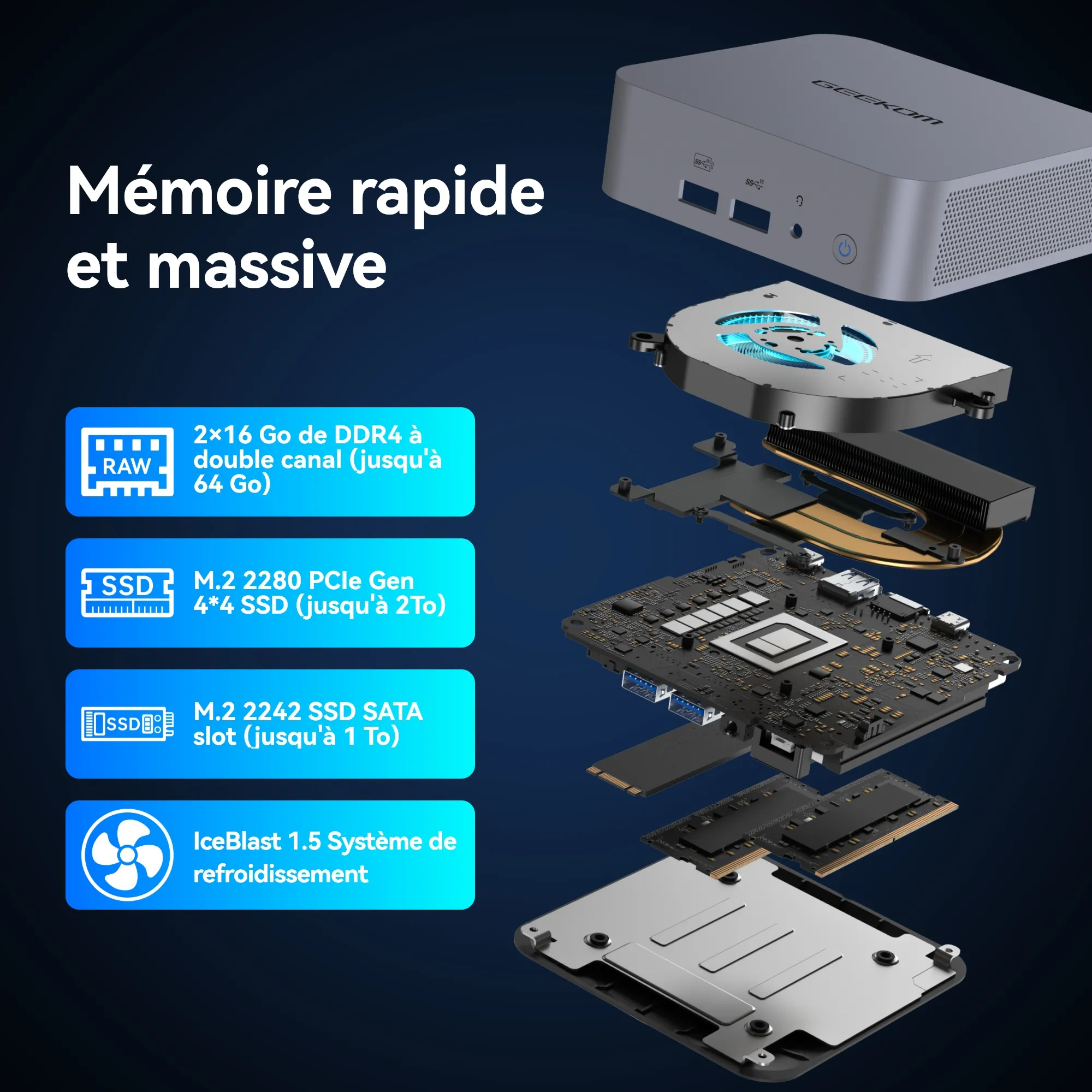 | Stockage | 1 x SSD (Pcie Gen 4*4), jusqu’à 2 To |