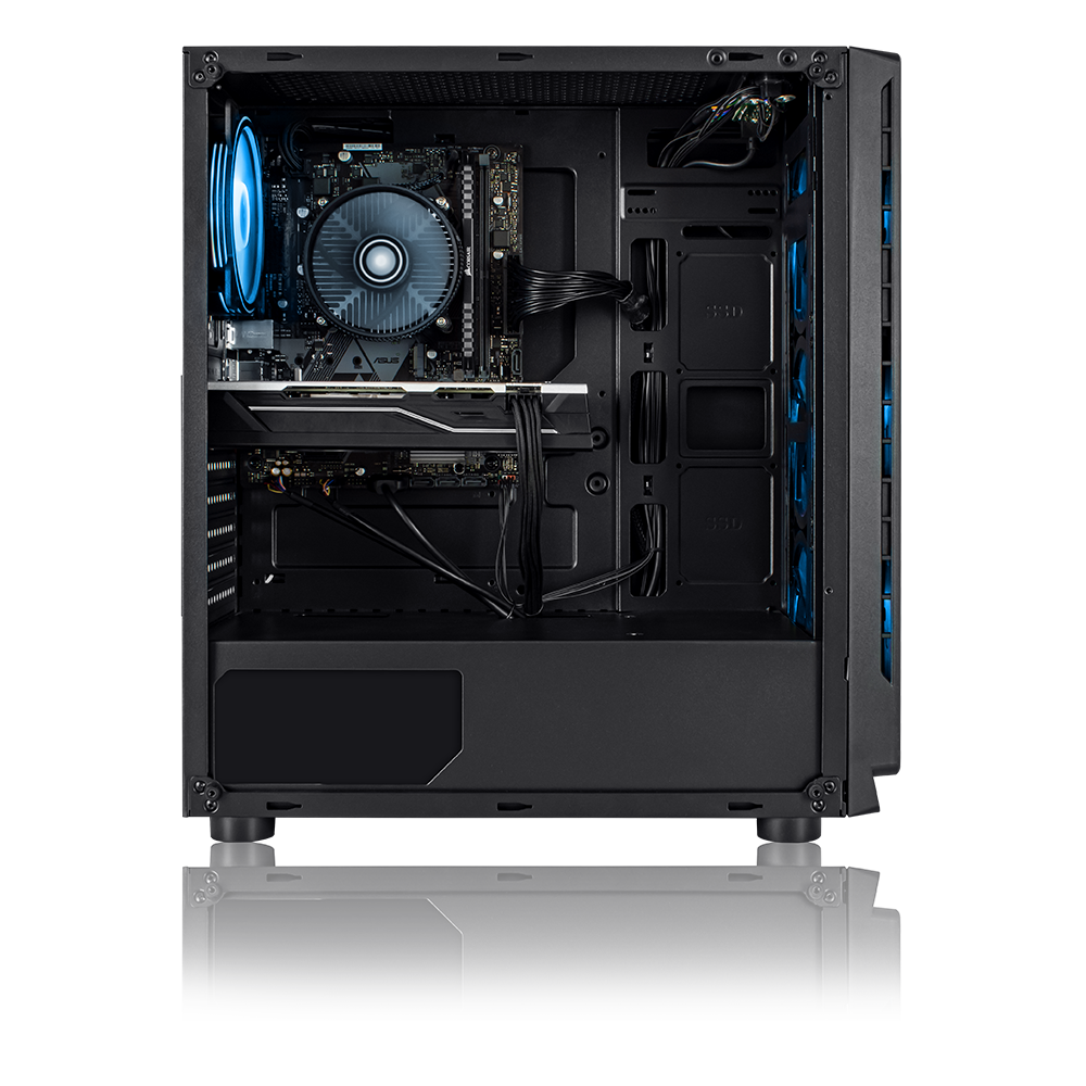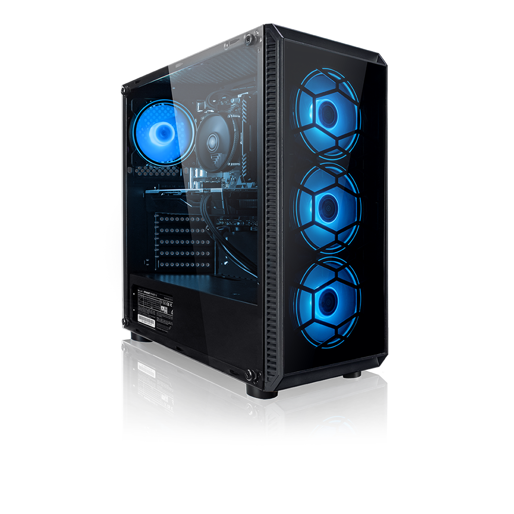 Notre boîtier maison avec 4 ventilateurs de boîtier éclairés en bleu est de haute qualité et t’offre un rapport qualité-prix imbattable. Sa fenêtre latérale en acrylique te permet de voir tous les composants. Le compartiment séparé pour le bloc d’alimentation garantit un visuel propre et une protection thermique supplémentaire à l’intérieur de la tour. Les entrées d’air latérales à l’avant et le couvercle magnétique en maille sur le dessus assurent toujours une bonne aération. Sur le panneau avant, tu trouveras un bouton d’alimentation, un bouton de redémarrage, des prises pour casque et microphone, 2x USB 2.0 et 1x USB 3.0 – tout ce dont tu as besoin pour jouer.